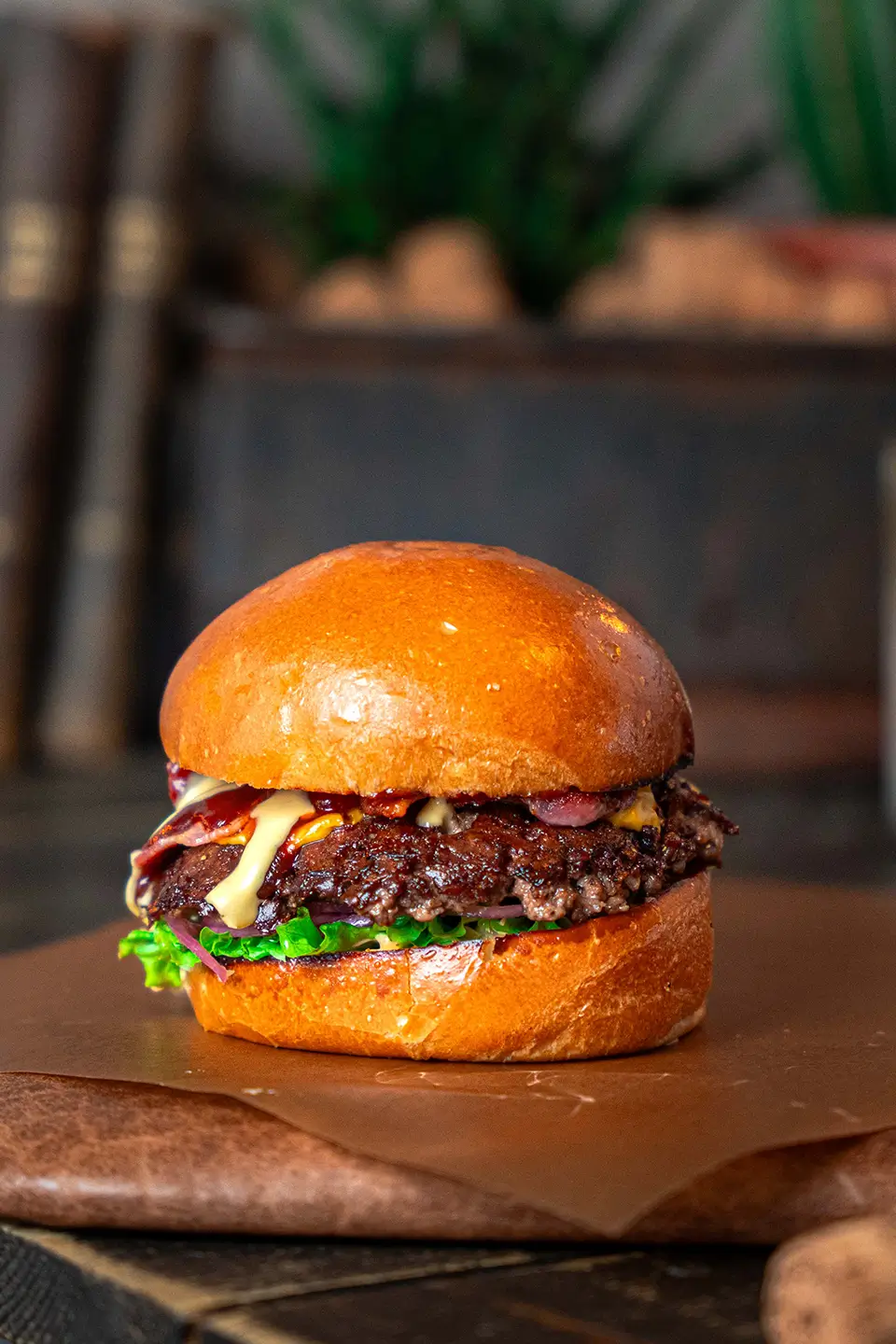 Chili de Luxe är en populär burgare hos oss som innehåller 150g nötkött med cheddarost, dressing, sallad, picklad rödlök, jalapeños, bacon, ostcréme och BBQ-sås. En smakrik burgare med balanserad hetta och rökighet som gör den till en tydlig favorit.